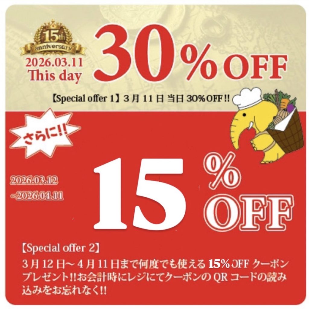 🎉周年当日(3月11日)は【お会計30%OFF】
